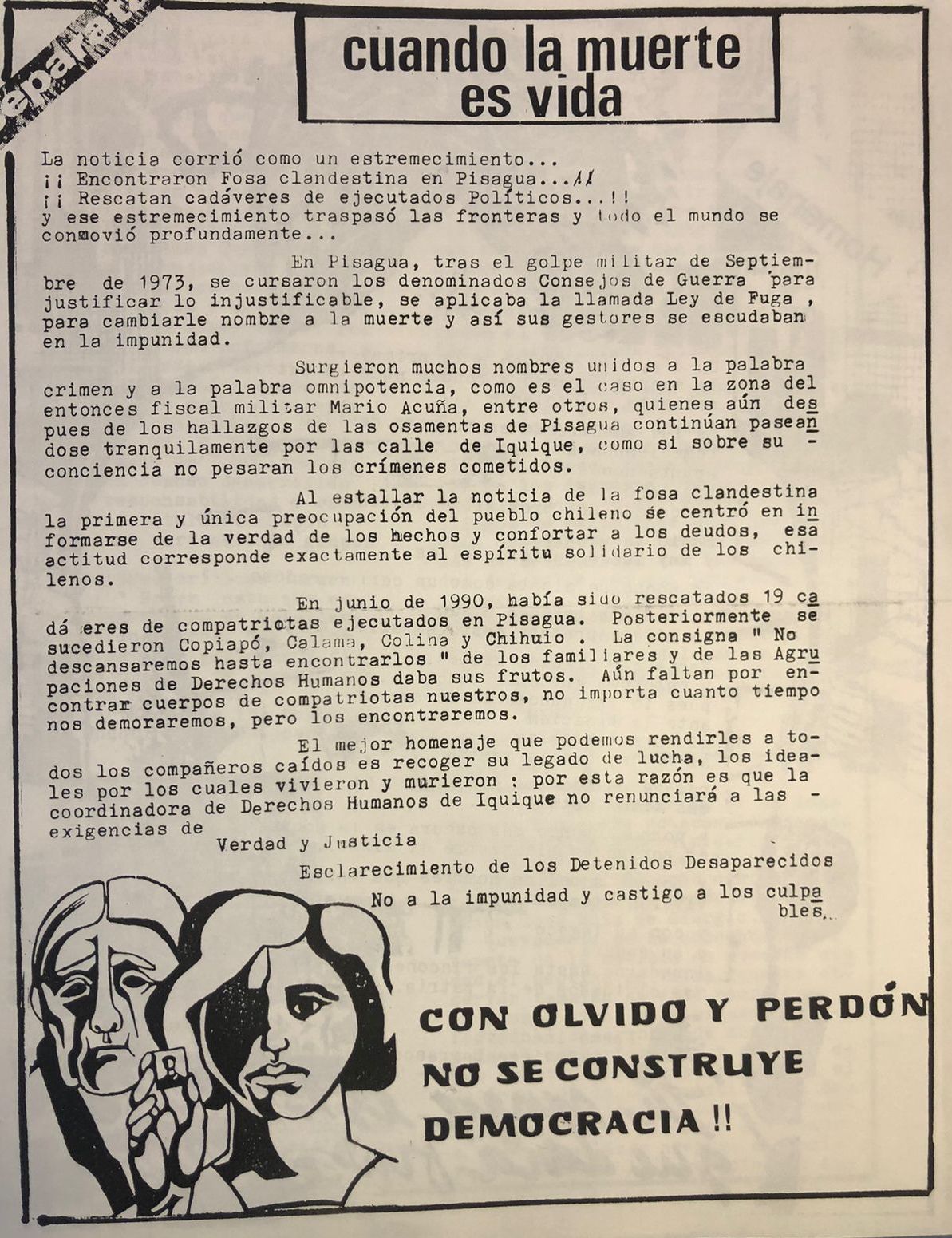 Boletín N°8. Mayo 1991. Coordinadora de Derechos Humanos Iquique (CO.DE.H.I). Separata «Cuando la muerte es vida». Fondo Organizaciones Sociales. Caja 14, pieza 4. Archivo Nacional de la Administración.