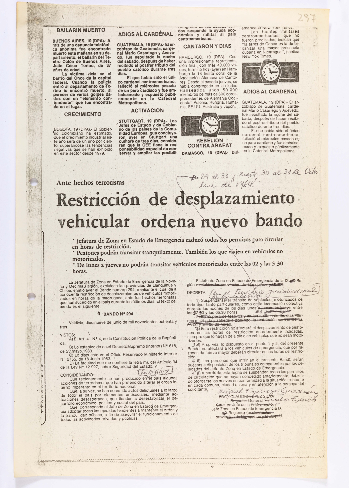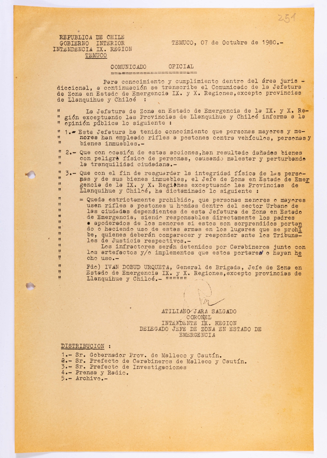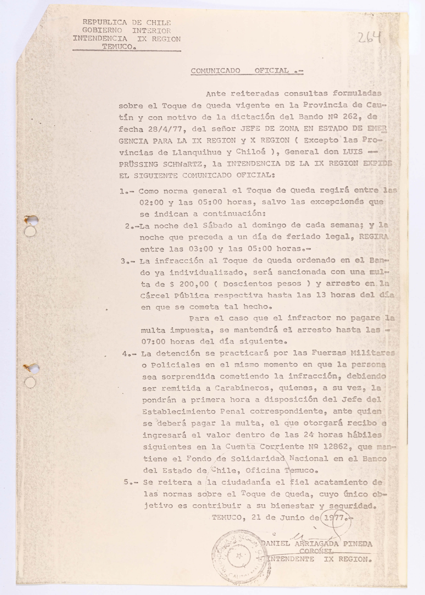 Selección de documentos del Fondo Intendencia de Cautín [Vol. 1195, otros documentos, años 1973-1988], perteneciente al Archivo Regional de La Araucania. Comparte FacebookWhatsApp Comunicado Oficial, Temuco, 21 de Junio de 1977 Comunicado oficial, Temuco, 7 de Octubre de 1980 Decreto Jefe de Zona Estado de Emergencia. Valdivia, 1 de junio de 1981 El Mercurio, 22 de Junio de 1984 Recorte de prensa, sin nombre ni fecha Comunicado Oficial, Temuco, 3 de Septiembre de 1986 Anterior Siguiente Anterior Siguiente