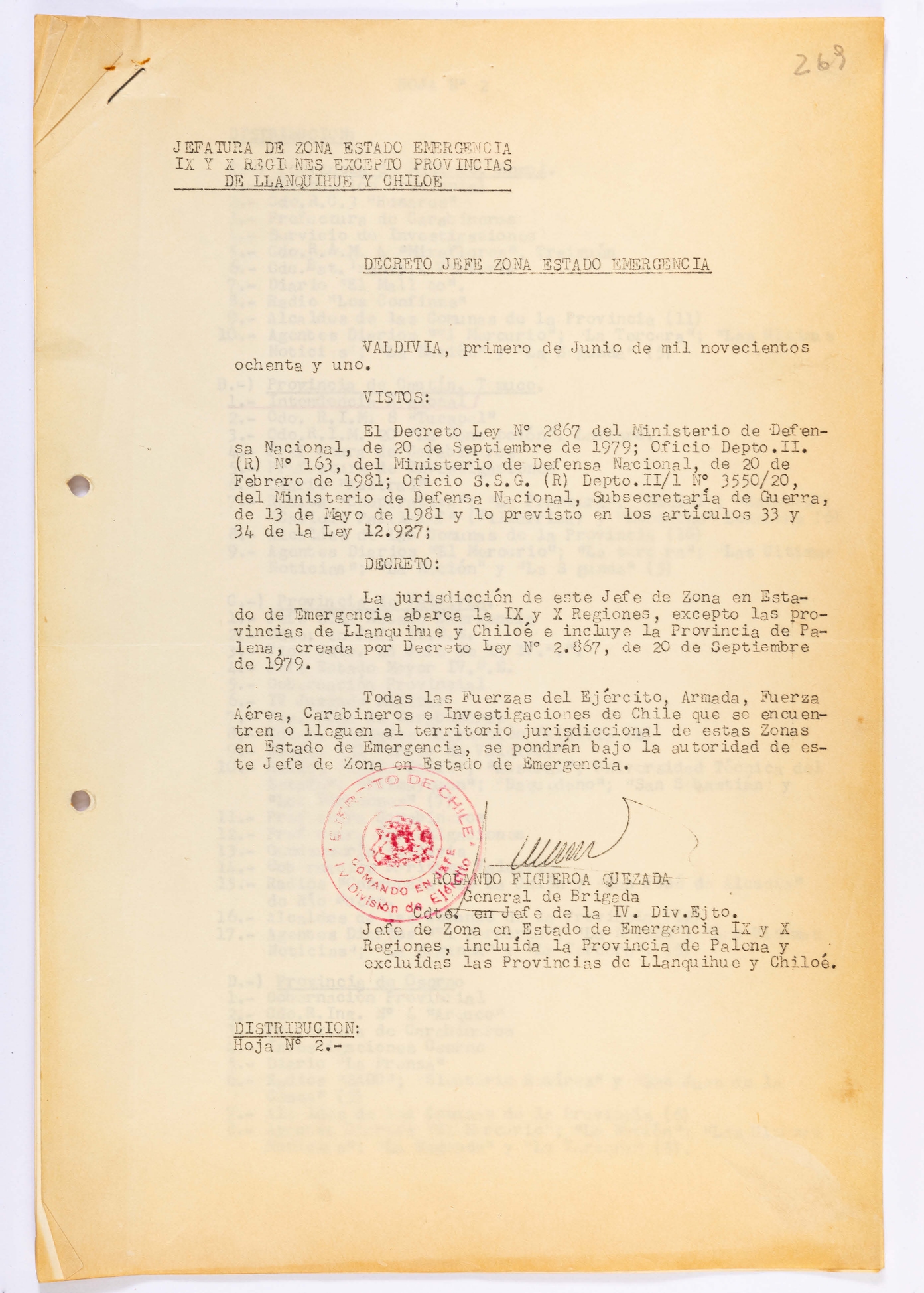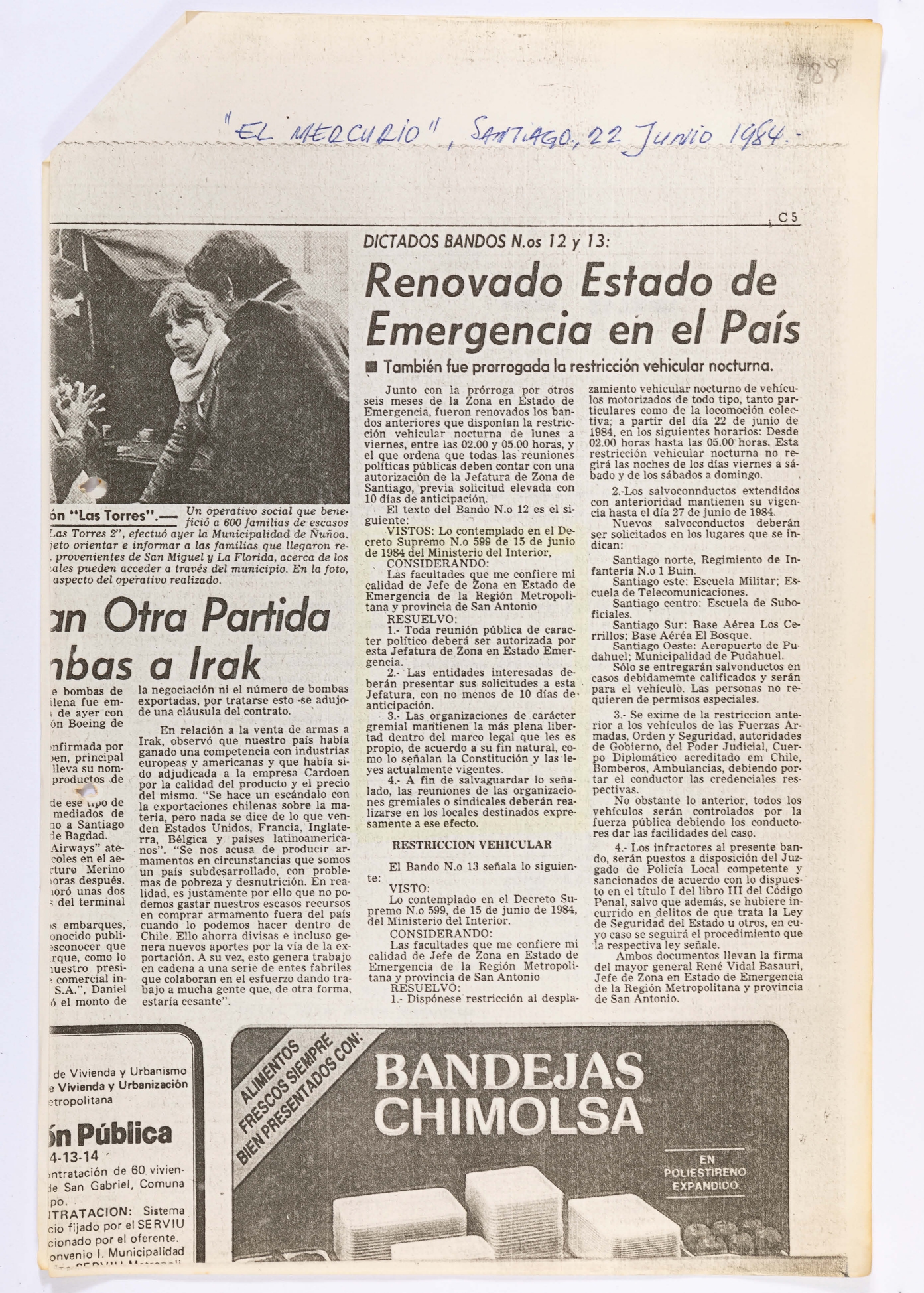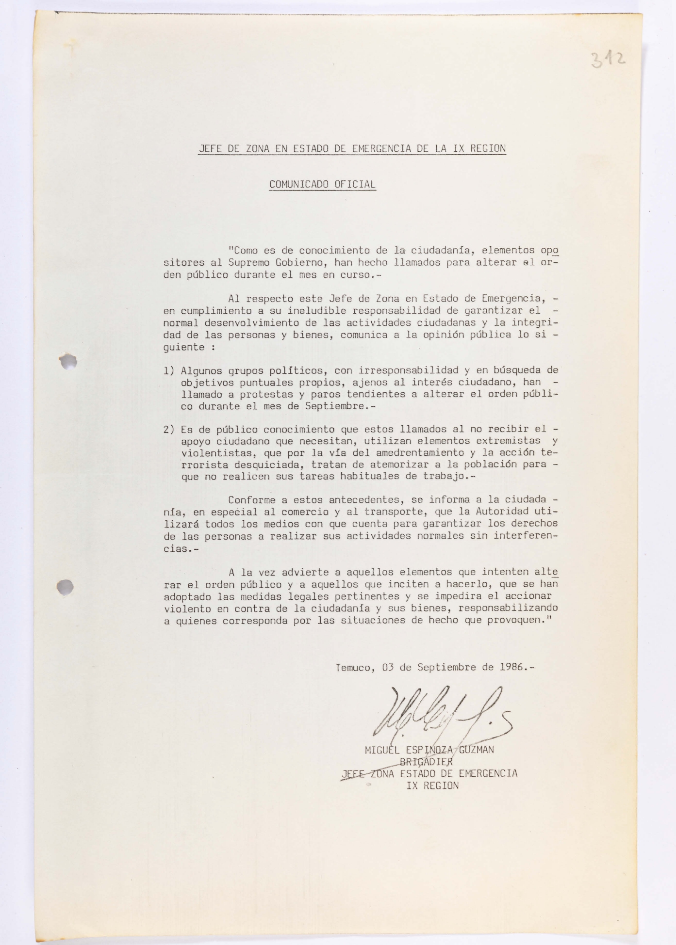 Selección de documentos del Fondo Intendencia de Cautín [Vol. 1195, otros documentos, años 1973-1988], perteneciente al Archivo Regional de La Araucania. Comparte FacebookWhatsApp Comunicado Oficial, Temuco, 21 de Junio de 1977 Comunicado oficial, Temuco, 7 de Octubre de 1980 Decreto Jefe de Zona Estado de Emergencia. Valdivia, 1 de junio de 1981 El Mercurio, 22 de Junio de 1984 Recorte de prensa, sin nombre ni fecha Comunicado Oficial, Temuco, 3 de Septiembre de 1986 Anterior Siguiente Anterior Siguiente